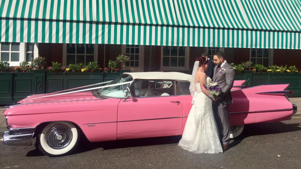 Wow ! If you want a car to impress this has to be the most impressive car for wedding travel. Built in the 1950's era, the time of Rock and Roll and Bill Hailey and the Comets, this fabulous Pink Cadillac Eldorado Convertible was the same as Elvis used to own in Memphis and LA. One can even imagine Lady Penelope in the back being driven by Parker. A simple stunning American Convertible with its High Fin Tails, wide white band tyres and a wealth of Chrome. Although a two door vehicle the rear seats tip fully forward at an angle to allow easier entry and exit.