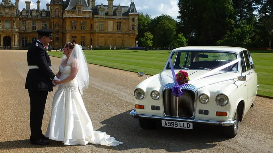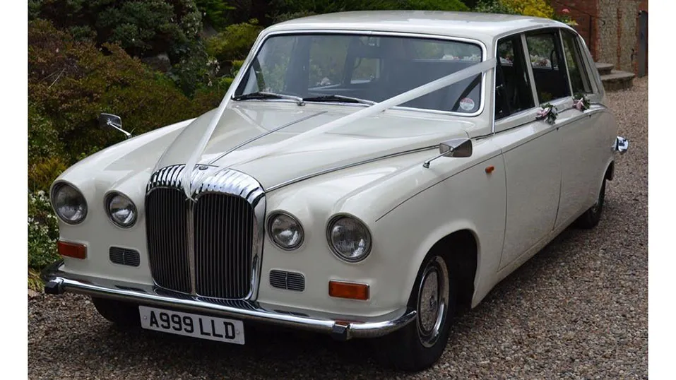 This Daimler limousine is resplendent in its traditional Ivory coachwork. The mainstay of Royal families and dignitaries the world over the DS420 is still in use today as a luxury limousine and used by many Embassies for their visiting Heads of State. The seating allows up to six passengers to travel in comfort in the main cabin and a seventh can travel in the front compartment next to the chauffeur if required. When the drop down seating is not in use and stowed away the cabin is very spacious and when just the Bride & Groom are travelling can accommodate the fullest of wedding gowns.