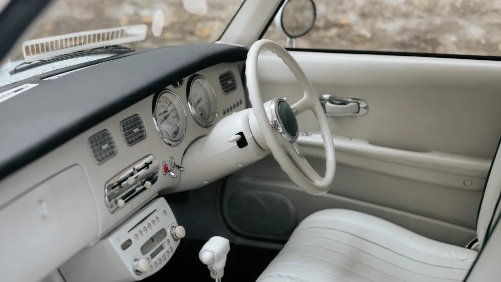 Surely any happy couple could not fail to fall in love with this cute Nissan Figaro Convertible, in an elegant shade of Powder Blue with a White top and White interior this certainly is a fun wedding car.