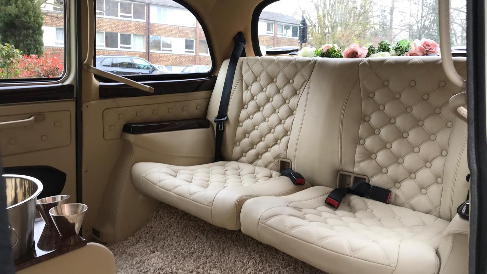 This ivory London taxi cab is one of our best wedding taxi cabs. It’s an original classic London taxi that’s been fully restored with extra luxuries. This includes ivory quilted leather seating and door panels; plush carpets with lambswool deep pile rugs; polished walnut wood interior, including door tops and armrests; and a champagne cabinet with an ice bucket and champagne glasses.