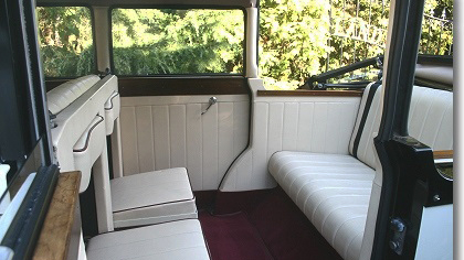 The Regent Landaulette is a modern car built in the style of the 1930’s era. It has very spacious leg and head room and is a very comfortable vehicle even for longer journeys. It can seat up to six people in comfort and its large wide opening doors provide for easy access for the fullest of wedding gowns. The opening rear roof section can be lowered or raised in minutes to suit the Bride & Groom. The interior is finished in a cream leather hide with Wilton carpeting.