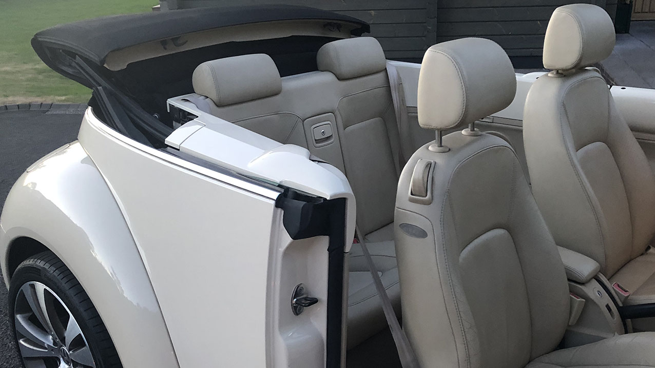 The modern version of the timeless German classic ‘Beetle’. You will certainly be the centre of attention in this cute Volkswagen Convertible as it certainly knows how to turn heads, both young and old. This South Wales based Beetle derived from the earlier models from the swinging sixties really does seem to bring out the best in people leaving smiles wherever it goes as its elegant charm is irresistible. In the traditional wedding colour of Ivory and with a cream interior what Bride and Groom could fail to fall in love with this cute little wedding car. Classic elegance of yesteryear with the mechanics and comfort of today.