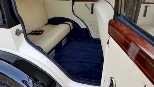 The interior is entered easily via large running board step and through wide doors into a beautiful spacious cream leather cabin with highly polished walnut wood veneers, with the cabin spacious enough for those choosing the fullest of wedding gowns. For those that wish to have a matching vehicle for Bridesmaids or others, one of the photos shows the Badsworth with the Bramwith Landaulette (Ref 446) which is the Limousine version seating up to seven passengers. The Badsworth is a truly beautiful wedding car.