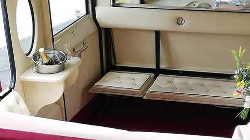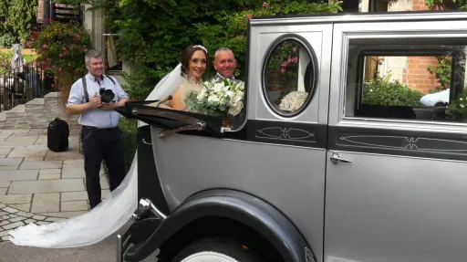 In the cabin there is a fitted ice bucket with glasses ready for the champagne if required, it also has a rather neat flower holder which is ideal for the brides bouquet to be placed, rather than on the floor or being held while driving. There is a running board on both sides and along with a retractable step ensures entry and exit is easy but perhaps the most striking thing about the landaulette is the oval picture frame window.