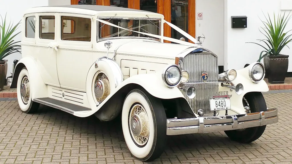 The Pierce Arrow is a Limousine built in the era towards the end of the Roaring Twenties and the start of the thirties, the time when the Charleston was the dance sensation sweeping the country.  This elegant Limousine can carry up to six passengers by use of the drop down occasional seats but remains very spacious when used for just two and provides space for the fullest of wedding gowns. In the elegant wedding colour of Old English White which is the soft white similar to Ivory, wide band whitewall tyres with spoke wheels and running boards on both sides for easy entry and exit this beautiful vintage limousine is sure to be the center of attention at any wedding, after the Bride of course.   We have two identical Pierce Arrow’s for those that would like a matching pair of cars [ref 591 and 592].